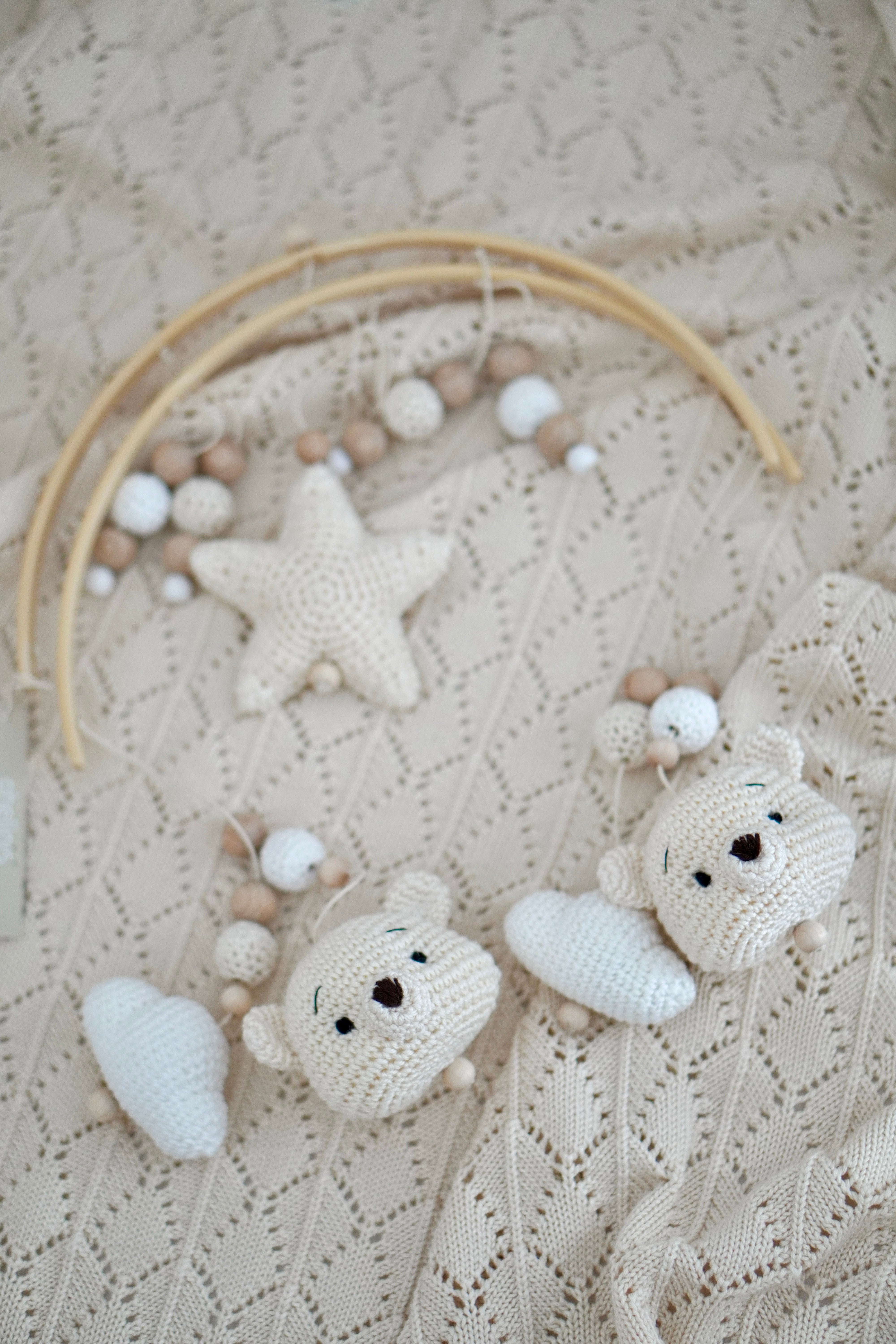 With us, you'll find unique baby gifts – handmade, high-quality, and customizable. Whether it's pacifier chains, stroller chains, grasping toys, rattles, music boxes, crocheted stuffed animals, play arches, premium baby knitwear, or 2-in-1 baby mobiles.